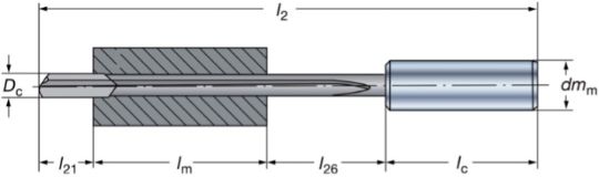 l2 - Общая длина сверла с хвостовикомDc - Диаметр сверлаl21 - Допуск на переточку твердосплавной головкиlm - Глубина сверленияl26 - Минимальное расстояние для отвода стружки (обычно 4D-6D)lc - Длина хвостовикаdmm - Диаметр хвостовика